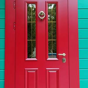 • яркая красная дверь в английском стиле с остеклением для загородного коттеджа.